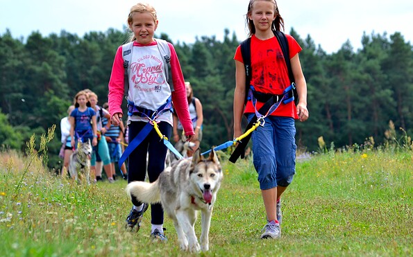 In die Herbstferien mit einer Huskie-Wandertour durch die Rheinsberger Natur starten? Das ist in Rheinsberg rund um den Wartturm möglich, durch den Herbstwald mit Schlittenhunden wandern! Mit den trainierten Vierbeinern kommen Sie richtig in Schwung. Es gibt auch eine kürzere Schnuppertour für Huskie-Wanderungen mit Kindern und Jugendlichen. Je nach Körperbau und Kondition wird der geeignete Hund ausgesucht, ggf. werden „3er-Teams" gebildet (2 Wanderer führen einen kräftigen Hund zusammen). Wandern mit Husky bedeutet, intensiven Kontakt zum Tier aufzubauen, etwas Hundesprache zu lernen und dann mit dem Tier für die Zeit der Wanderung ein Team zu werden. Jeder Teilnehmer erhält eine Einweisung in die Wandertechnik und einen speziellen Bauchgurt, an dem die Leine des Huskys befestigt wird - so haben Sie jederzeit die Hände frei!